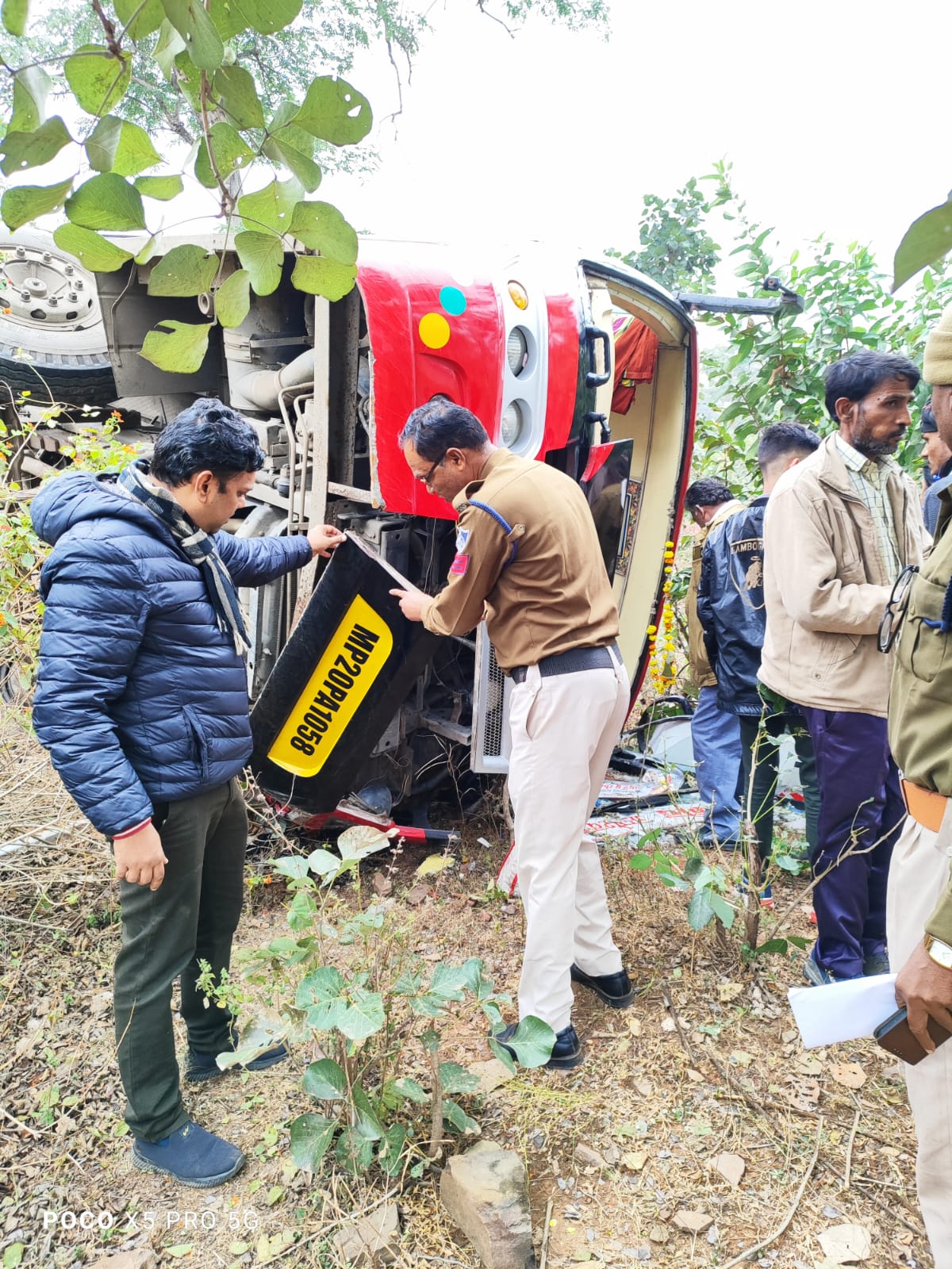 जबेरा थाना क्षेत्र में गड्ढों में गिरकर तेज रफ्तार यात्री बस पलटी, ३० से अधिक घायल, टाई रॉड टूटने से दाने बाबा के समीप हुआ हादसा