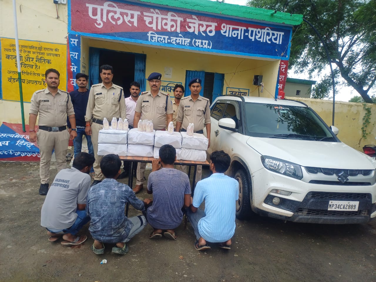 सूचना पर कार्यवाही करते हुए पुलिस की टीम जब मौके पर पहुंची तो किशुनगंज की ओर से उक्त कार आती हुई दिखाई थी। जब कार को रोककर उसकी तलाशी ली गई तो उसमें अवैध शराब परिवहन होना पाया गया। जप्त की गई अवैध शराब का मूल्य करीब 40 हजार रुपए आंका गया है। पुलिस के मामले में चार आरोपी जिसमे वाहन चालक राजा पिता घनश्याम राय 25 वर्ष निवासी हरदृानी नारायाण थाना दमोह देहात, सत्यम पिता सूरज राय 26 वर्ष निवासी हरदृानी नारायण थाना दमोह देहात, स्व्पनिल पिता ऋषि राय 26 वर्ष निवासी खेजरा थाना दमोह देहात, दिनेश पिता धनीराम साहू 25 वर्ष निवासी बाजार मुहल्ला नरसिहगढ के विरुद्ध मामला दर्ज करते हुए घटना में प्रयुक्त वाहन जिसकी अनुमानित कीमत 10 लख रुपए है उसे जप्त किया गया है।