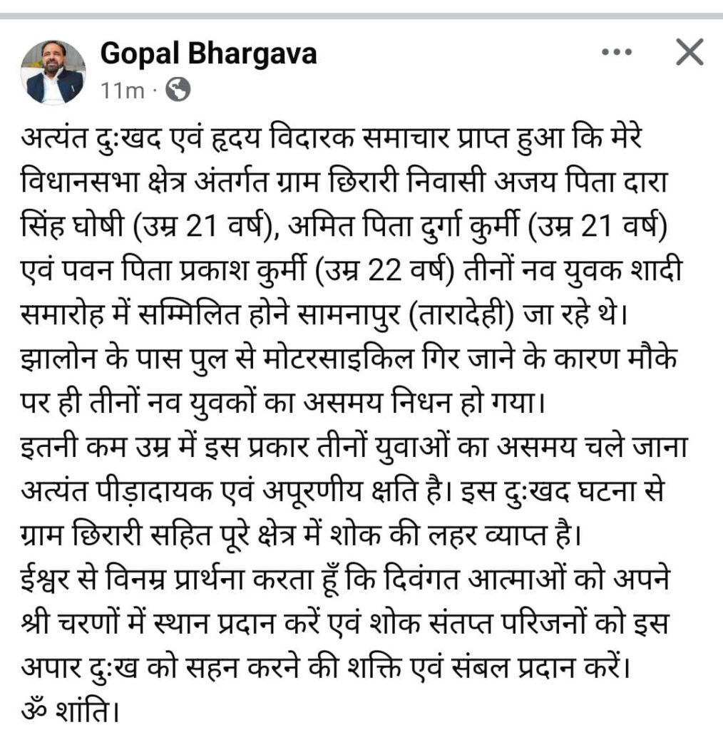 इस घटना पर प्रदेश के पूर्व मंत्री और गढ़ाकोटा विधायक गोपाल भार्गव ने अपना शोक जताया है। सोशल मीडिया प्लेटफॉर्म पर उन्होंने घटना की जानकारी साझा करते हुए संवेदनाएं प्रगट की है।
